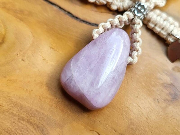 Handgemaakte edelsteen ketting van naturel-kleur waxkoord, verwerkt met kunziet- en RVS kralen aan een kunziet amulet (doorboord). De kunziet zit vast aan de ketting en is daardoor niet verwisselbaar. De ketting heeft een schuifknoop voor het verlengen of inkorten naar wens. Lengte ketting: Anahata, hart-chakra (ca. 50-75 cm.). Steen: 3 cm.