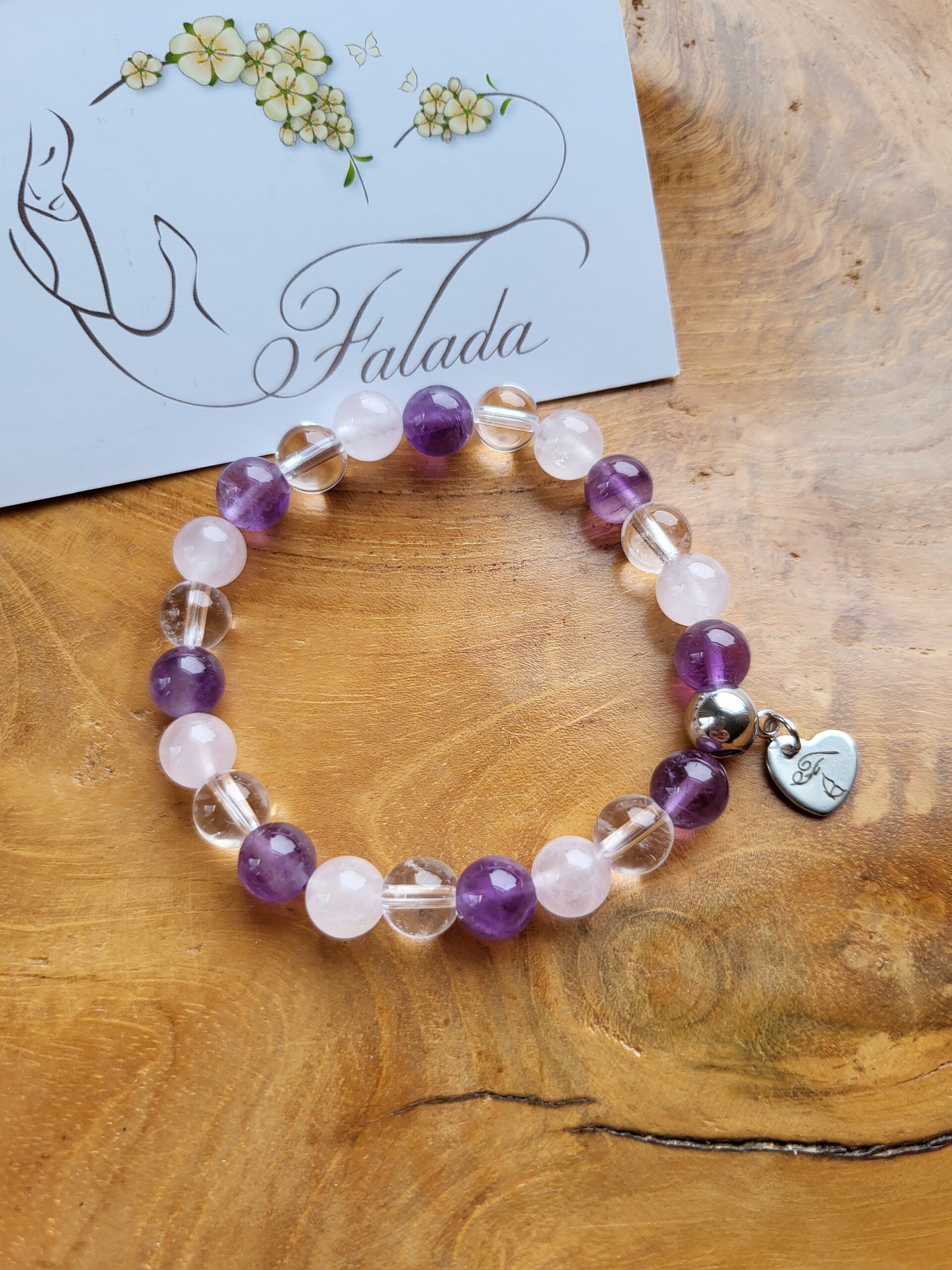 Amethist AB-klasse, bergkristal A-klasse en rozenkwarts kralen armband aan dubbel geregen elastiek met RVS kraal/label, verkrijgbaar in zilver of goud. De kralen van de armband zijn ca 8mm diameter.