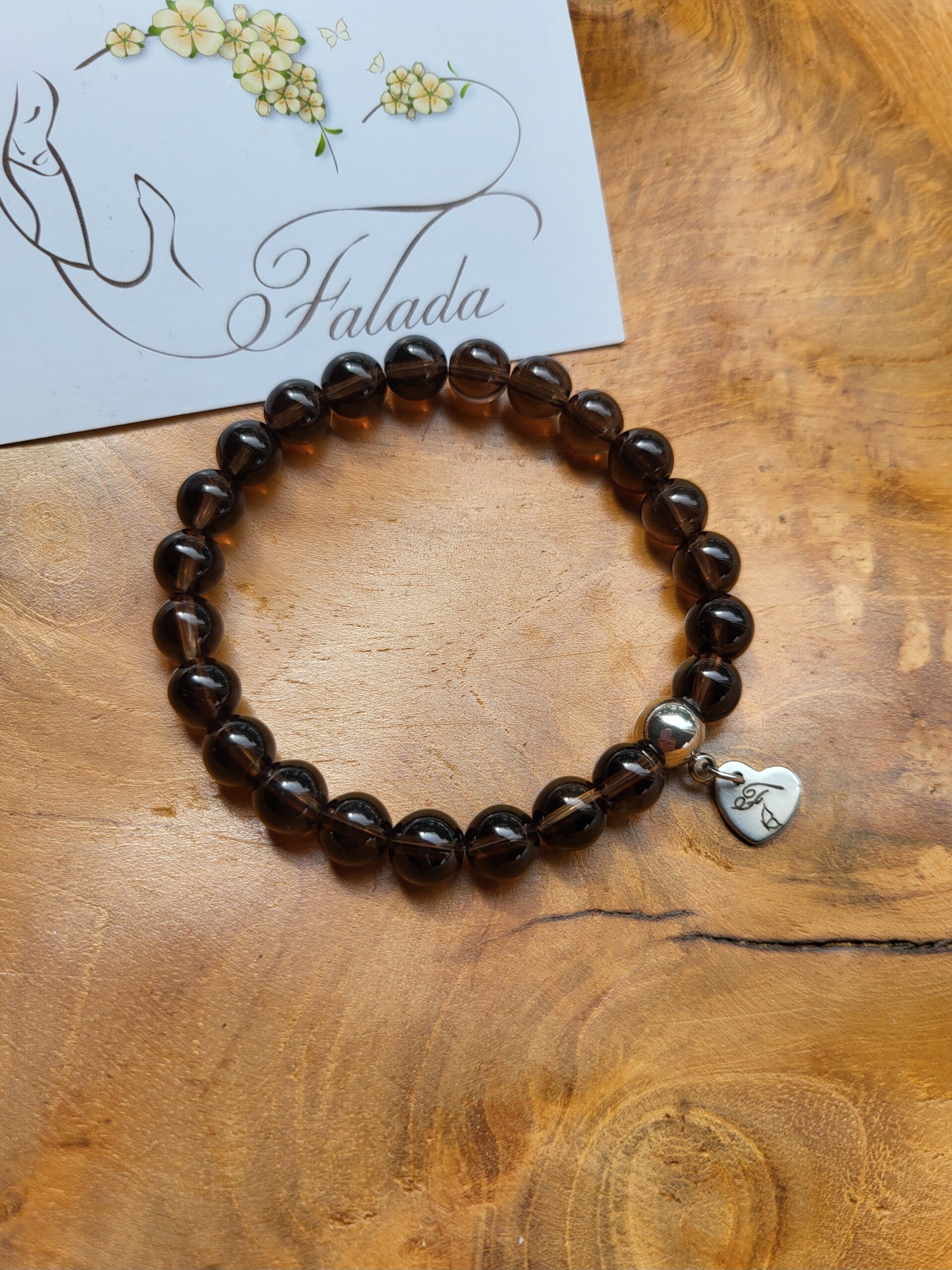 Rookkwarts kralen armband aan dubbel geregen elastiek met RVS kraal/label, verkrijgbaar in zilver of goud. De kralen van de rookkwarts armband zijn ca 8mm diameter.