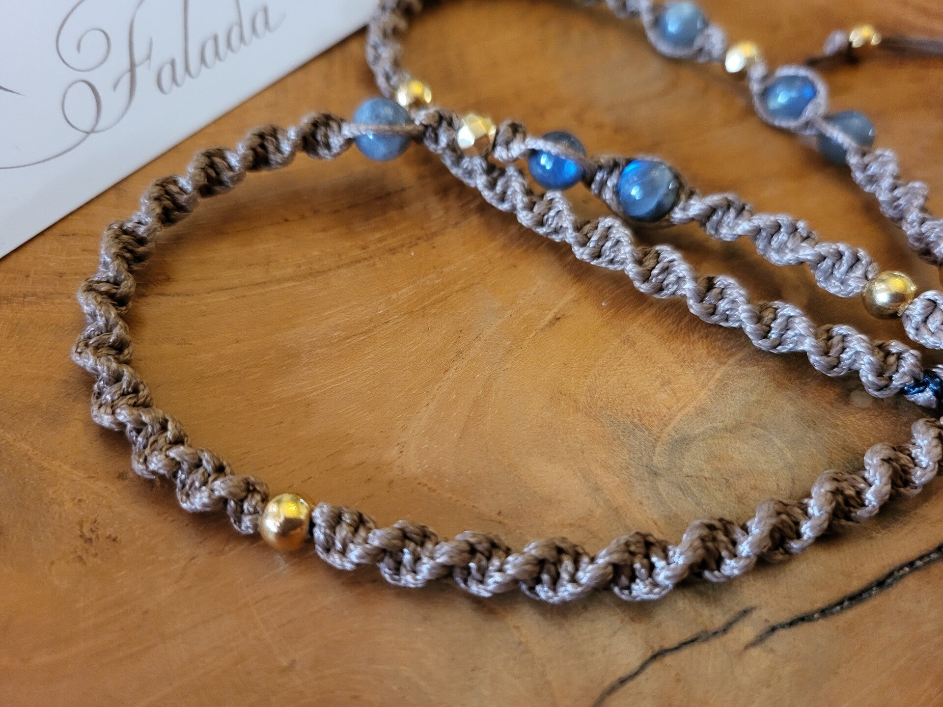 Handgemaakte edelsteen ketting geknoopt in donker kaki waxkoord met 6 labradoriet kralen aan een labradoriet druppel amulet (doorboord). De labradoriet zit vast en verwerkt aan de ketting. Je kunt deze dus niet wisselen. De gouden kralen in deze ketting zijn van RVS en de ketting heeft een schuifknoop voor het verlengen of inkorten naar wens. Lengte ketting: Anahata, hart-chakra (ca. 50-75 cm.). Steen: 3.4 cm.