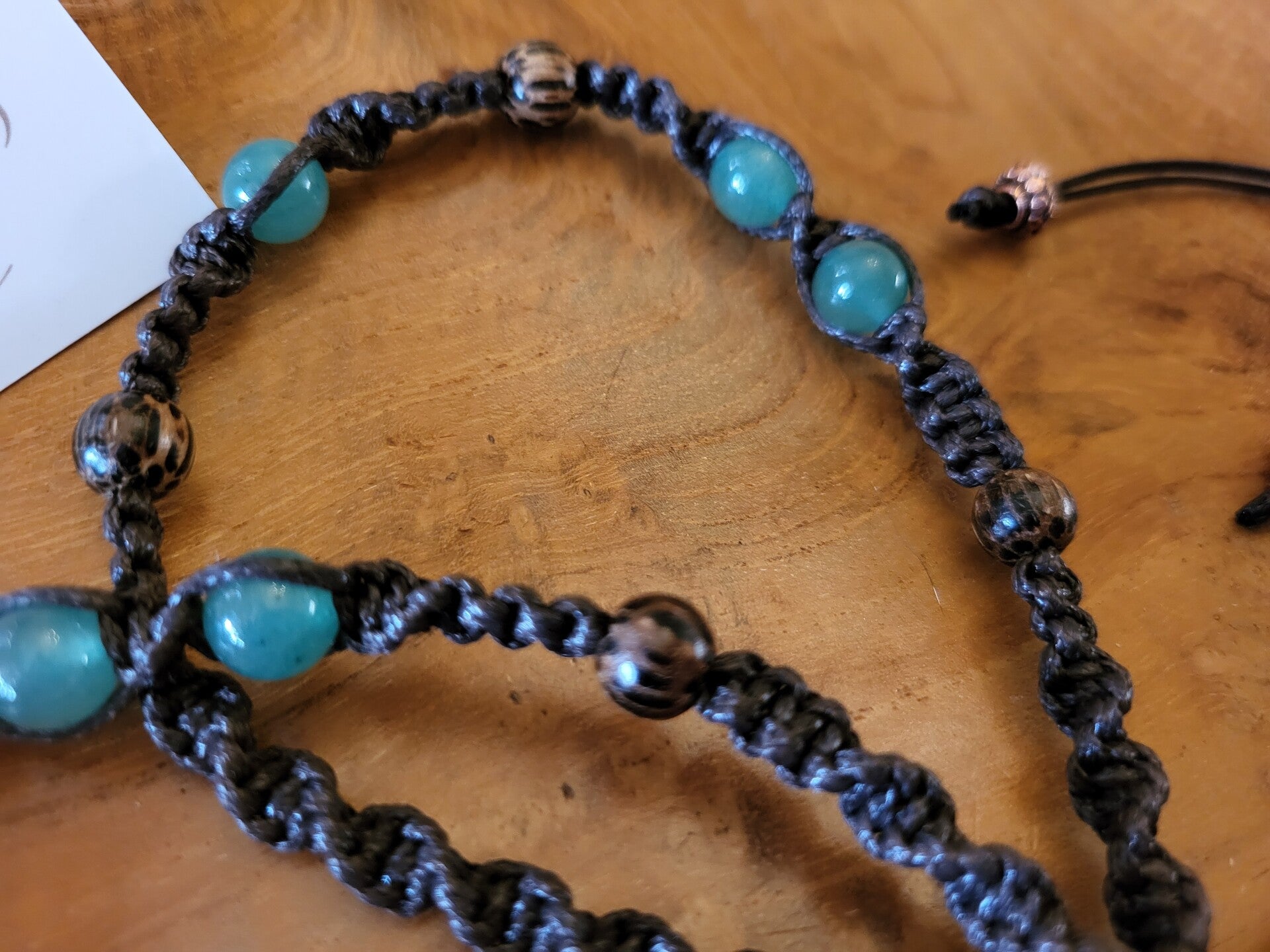 Handgemaakte edelsteen ketting van coffee-brown waxkoord met aventurijn- en houten kralen aan een groene aventurijn amulet. Deze zit vast aan de ketting en is daardoor niet verwisselbaar. De kraal boven de groene aventurijn amulet is van koper. De ketting is voorzien van een schuifknoop voor het verlengen of inkorten naar wens. Lengte ketting: Anahata, hart-chakra (ca. 50-75 cm.). Steen: 2.7 cm.