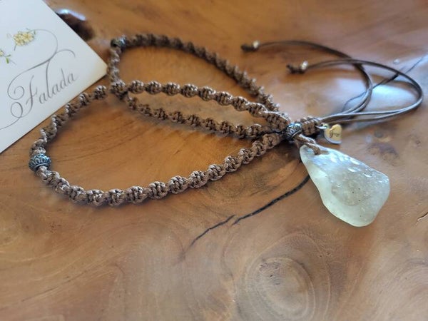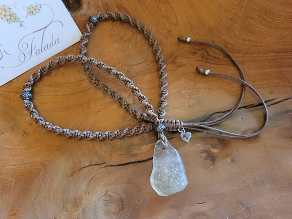 Handgemaakte edelsteen ketting van donker-kaki waxkoord, verwerkt met RVS kralen en subtiel geknoopt aan een prachtig stukje libisch woestijnglas (doorboord). De libisch woestijnglas zit vast aan de ketting en is daardoor niet verwisselbaar. De ketting heeft een schuifknoop voor het verlengen of inkorten naar wens. Lengte ketting: Anahata, hart-chakra (ca. 50-75 cm.). Steen: 4 cm.