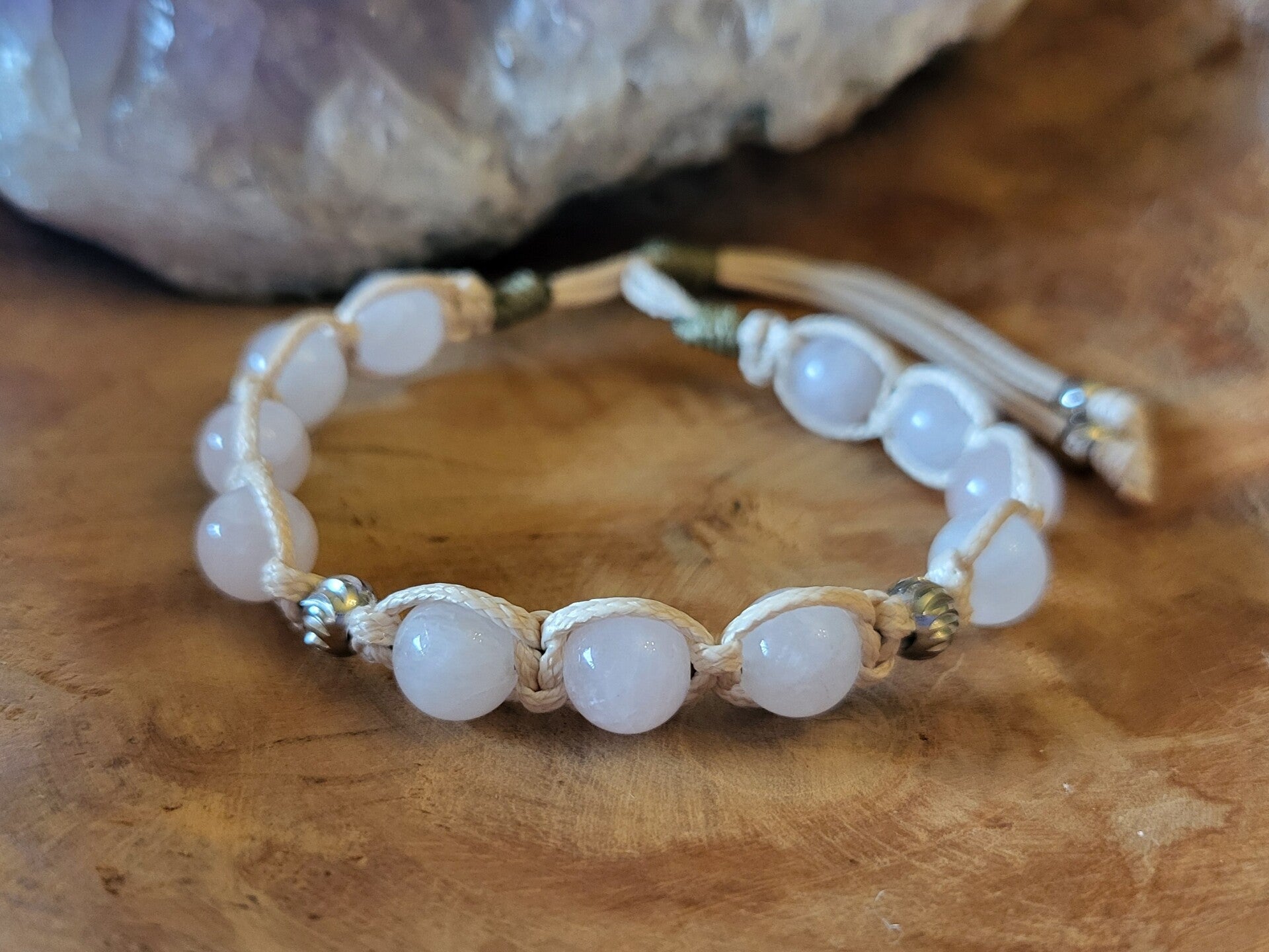 Handmade Shamballa armbandje met rozenkwarts en rvs kralen. Geknoopt in naturel met groen waxkoord.