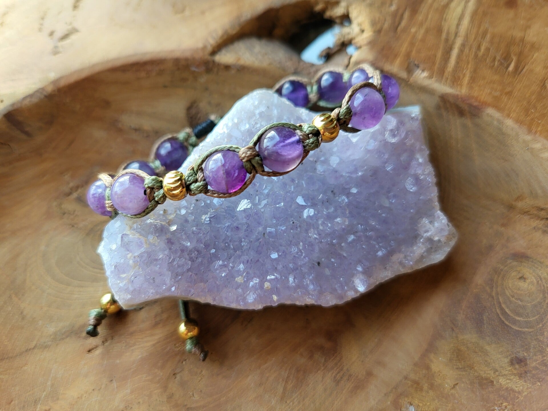 Handmade Shamballa armbandje met amethist en rvs (goud) kralen. Geknoopt in groen en kaki waxkoord.