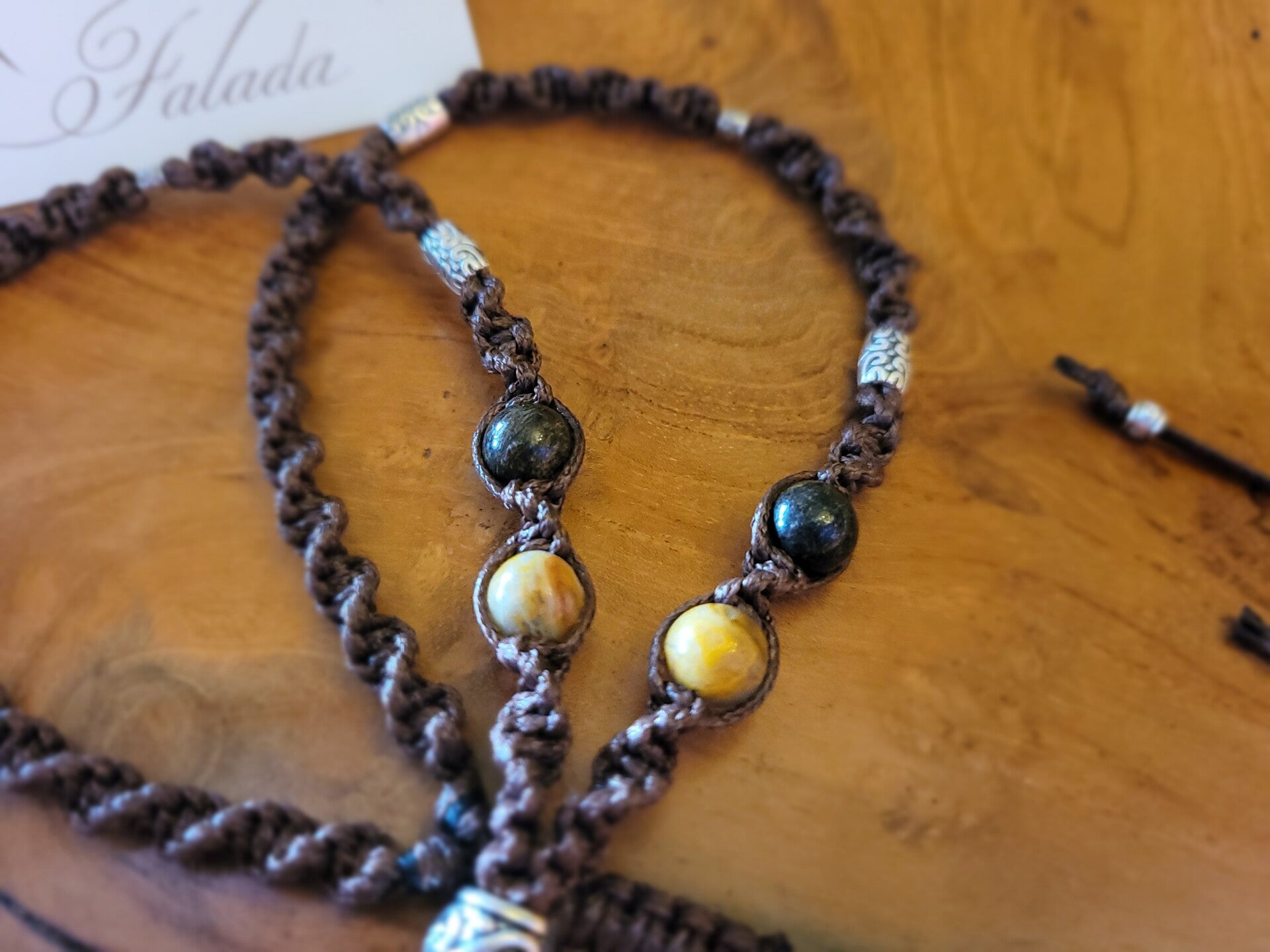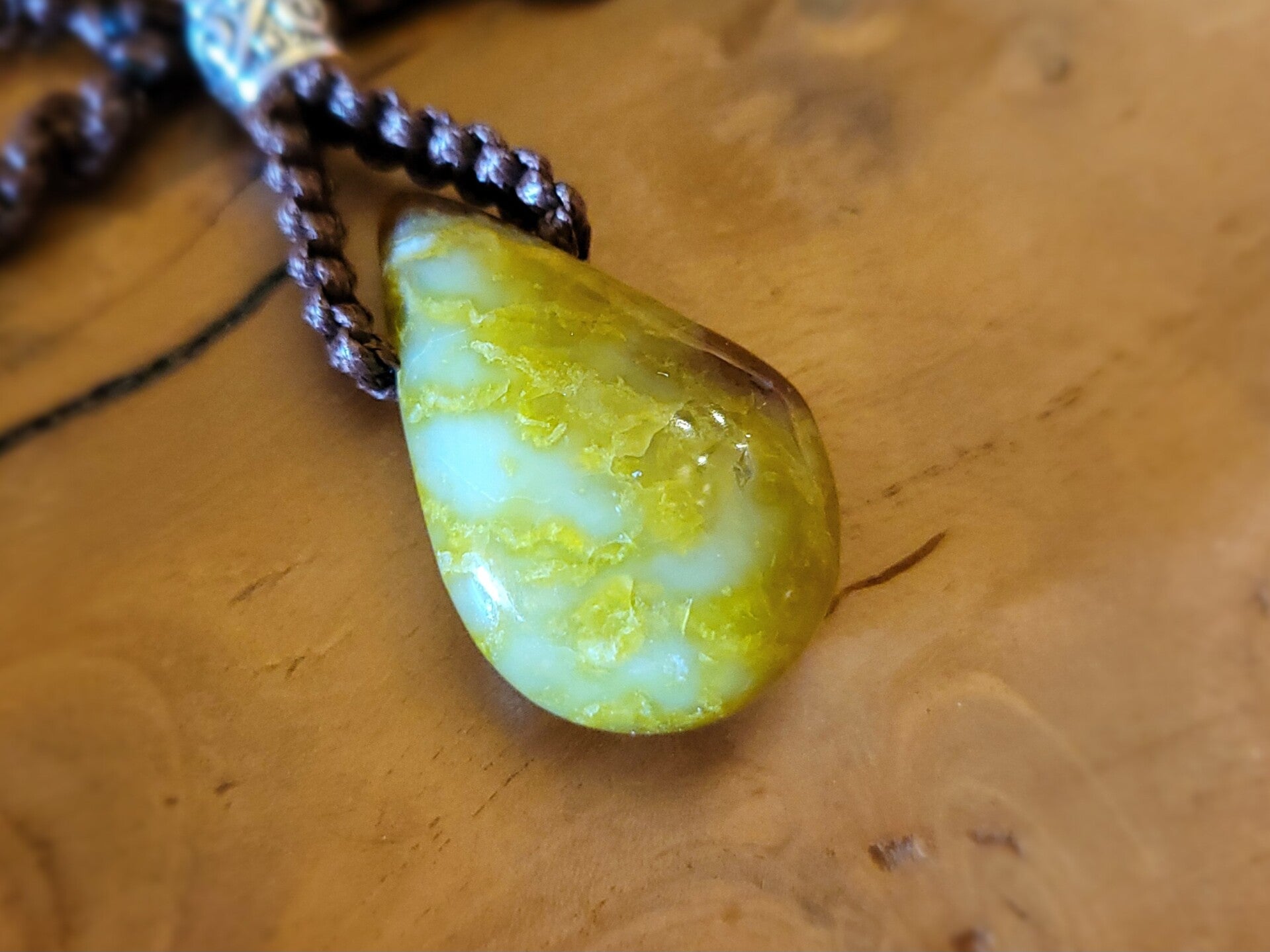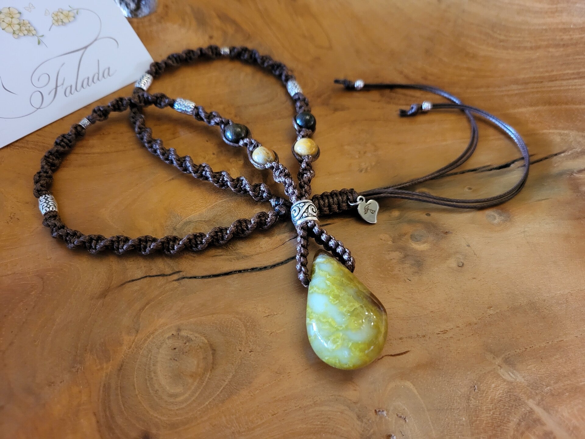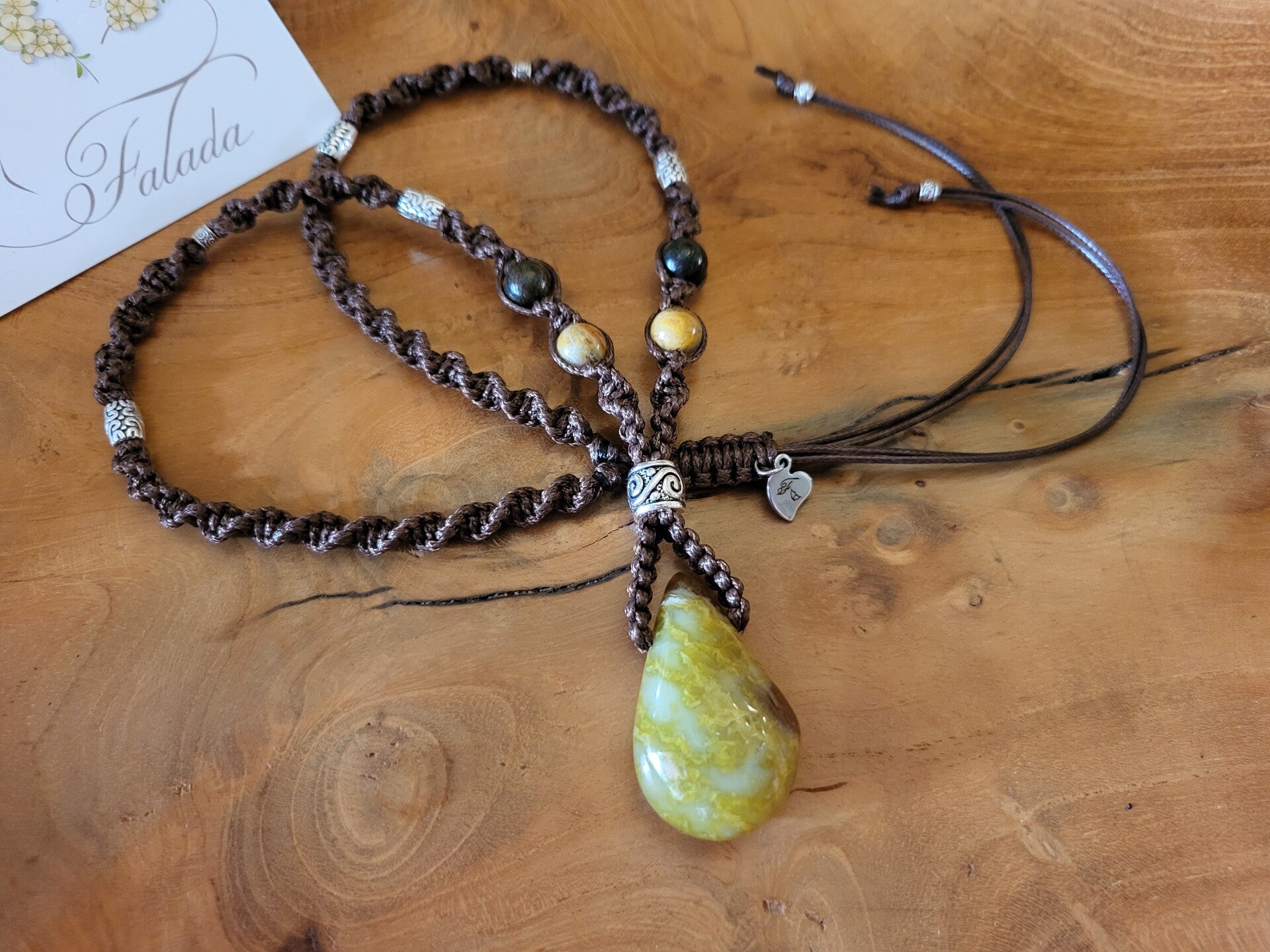 Handgemaakte edelsteen ketting in kastanjebruin waxkoord verwerkt met bronziet- en crazy lace agaat kralen en zilvermetalen kralen aan een groene opaal druppel amulet (doorboord). Deze zit vast en verwerkt aan de ketting en kan dus niet gewisseld. De ketting heeft een schuifknoop voor het verlengen of inkorten naar wens. Lengte ketting: Anahata, hart-chakra (ca. 50-75 cm.). Steen: 3.9 cm.