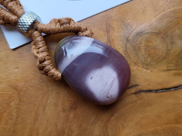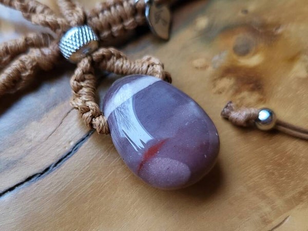 Handgemaakte edelsteen ketting, spiraal geknoopt in lichtbruin waxkoord met RVS kraal aan een mookaiet amulet (doorboord). De mookaiet zit vast en verwerkt aan de ketting en kan dus niet gewisseld. De ketting heeft een schuifknoop voor het verlengen of inkorten naar wens. Lengte ketting: Anahata, hart-chakra (ca. 50-75 cm.). Steen: 2.7 cm.